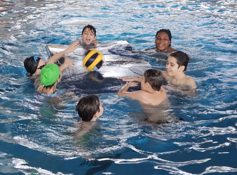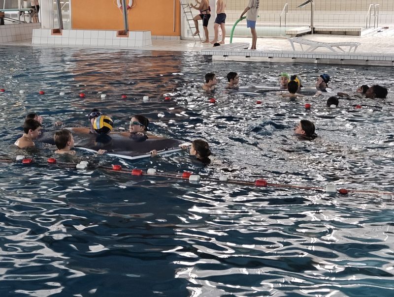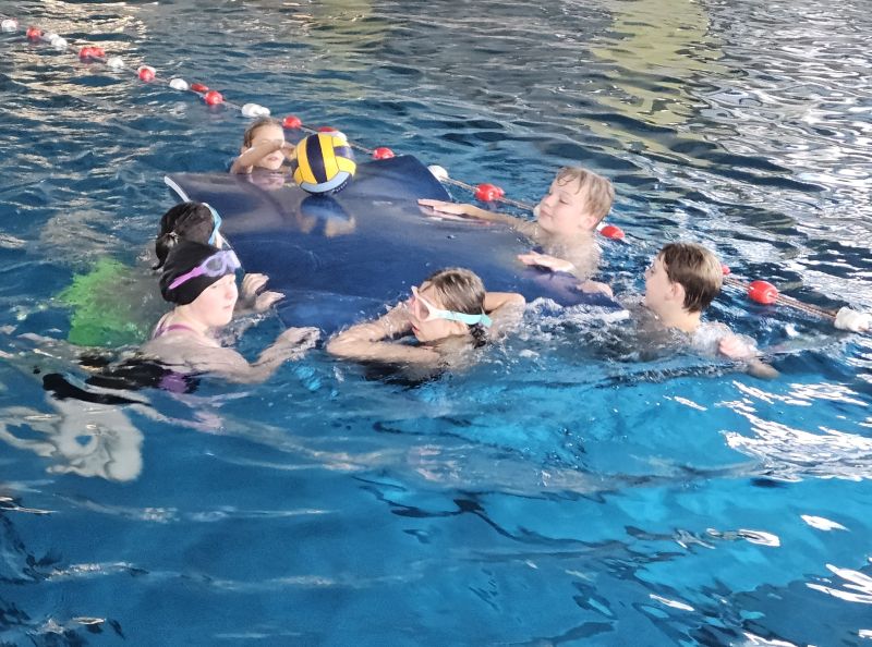 Diese Frage mussten unsere Schwimmer aus den Klassen 5.3 und 5.4 heute in der Schwimmhalle lösen. Gemeinsam mussten sie einen Ball auf einer großen Schwimmmatte von einem Beckenrand zum anderen transportieren – natürlich ohne dass der Ball ins Wasser rollt.