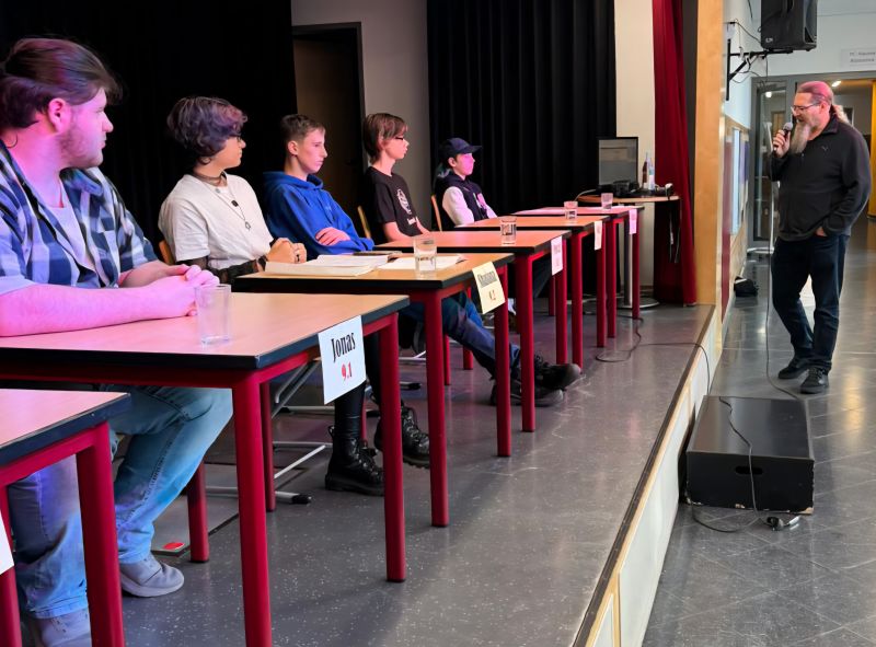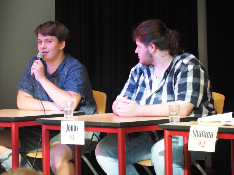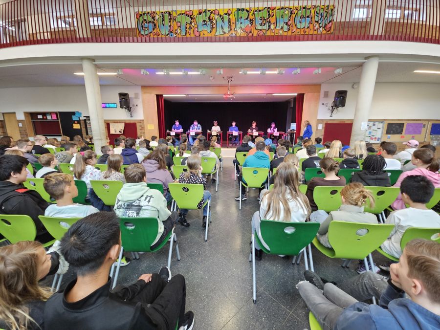 Alle Kandidat*innen hatten sich sehr gut auf die Fragerunde vorbereitet. Die Fragen waren zuvor in den Klassen gesammelt und ausgewertet worden. In der ersten Runde erhielten alle Kandidat*innen dieselben Fragen. Danach beantworteten sie individuelle Fragen zu ihren Wahlvorhaben und Ideen.