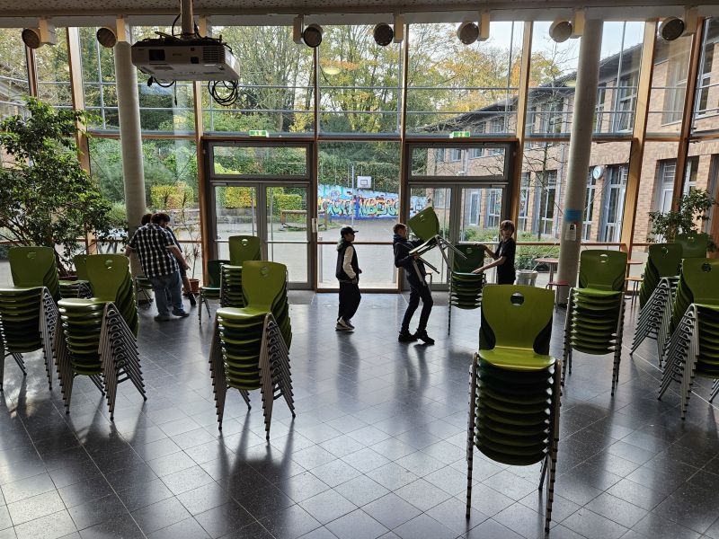 Vorbildlich zeigten sie danach, dass sie nicht nur reden, sondern auch anpacken können und halfen unserem Hausmeister Herrn Arth dabei, die Stühle aus dem Forum wieder ins Lager zu schaffen.