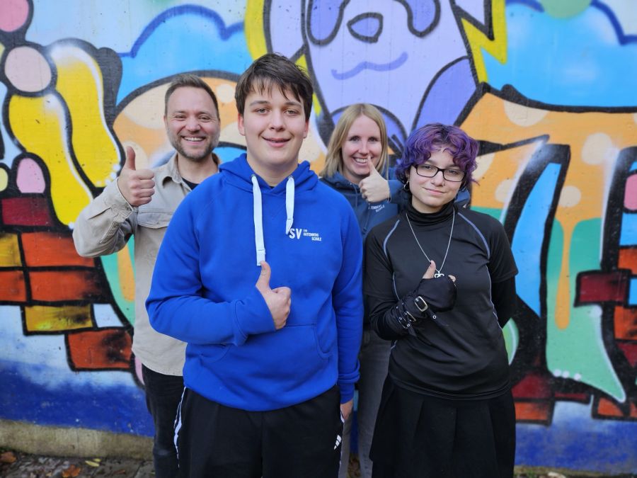 Dann ging es zum Fototermin, an dem auch Herr Hertel vom LVR teilnahm. Herr Hertel ist Referent für digitale Kommunikation im LVR-Dezernat Schulen und dreht für unseren Schulträger eine Reportage über den Ablauf der Schülersprecherwahl für die LVR Internetseite: