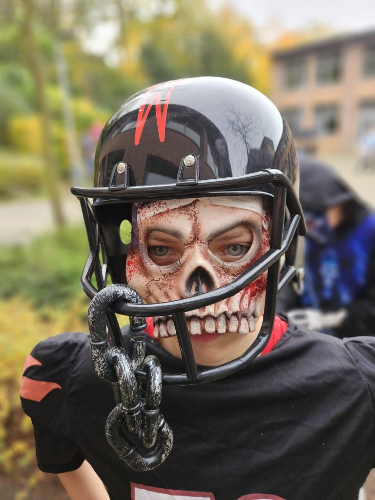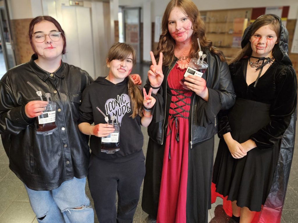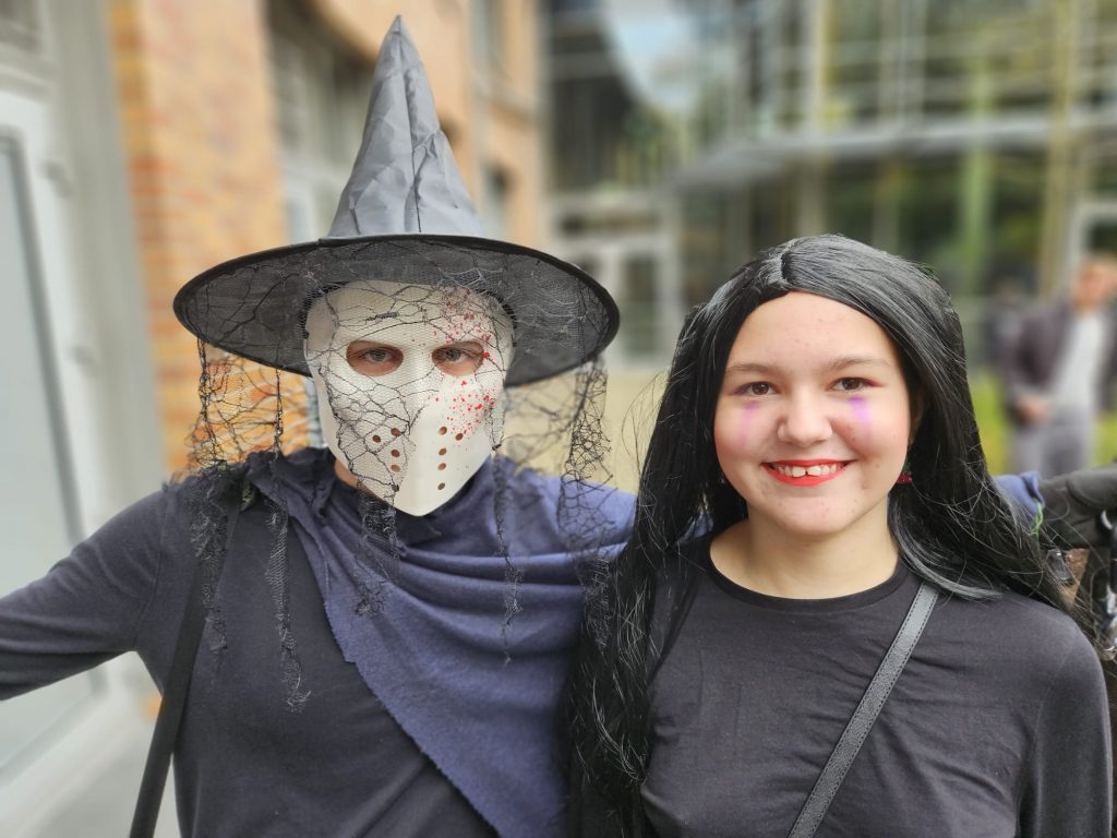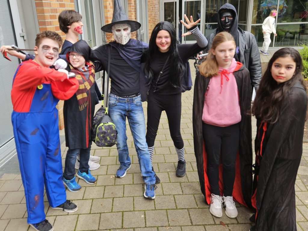 Heute ist Halloween und unsere Schüler haben sich dem Anlass entsprechend in gruselige Outfits geworfen. Von Blutrünstig bis Hexerei war alles vertreten. In Sachen Makeup und Kostüm konnte man liebevolle Detailarbeit und künstlerisches Talent entdecken.