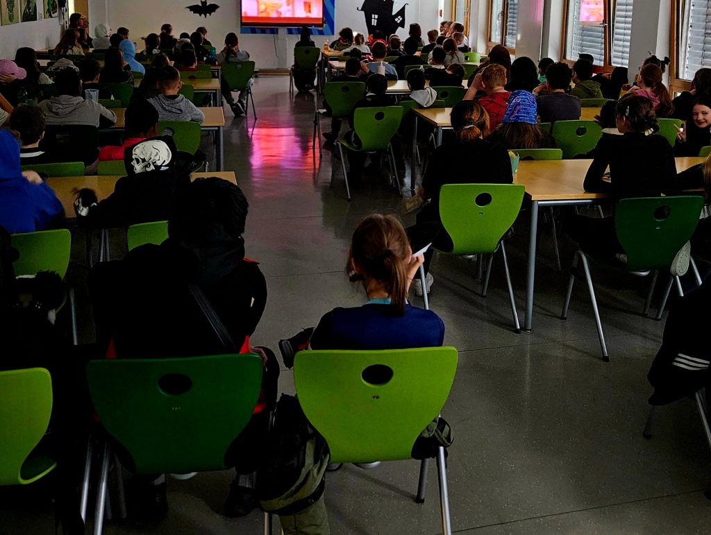 Unsere SV hatte sich für den heutigen Tag etwas Besonderes ausgedacht. In den letzten beiden Unterrichtsstunden wurde ein „Halloween-Kino“ veranstaltet. Es gab 2 Filmangebote, eines in der Mensa und eines im Forum. Natürlich gab es Snacks für alle, denn es heißt ja nicht umsonst zu Halloween: „Süßes, sonst gibt’s Saures!“