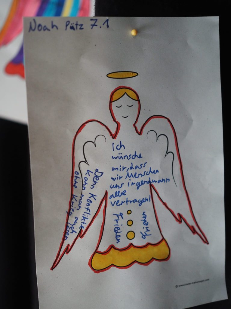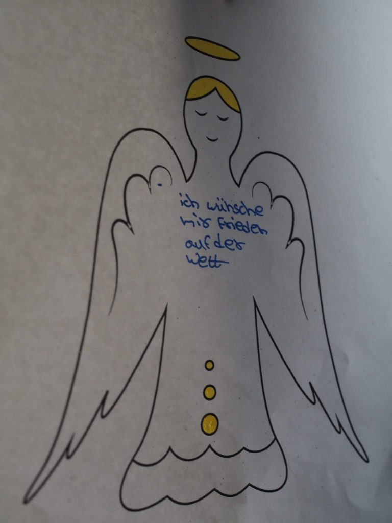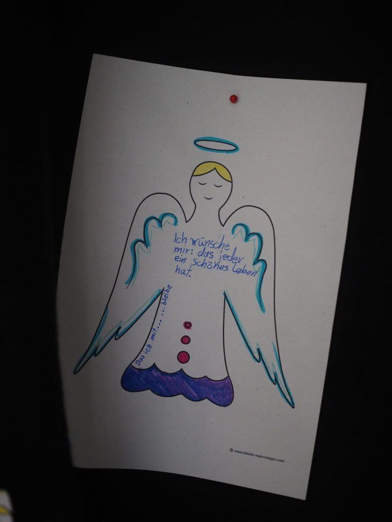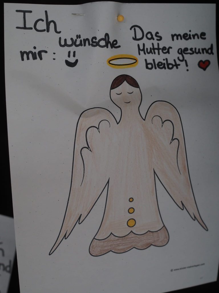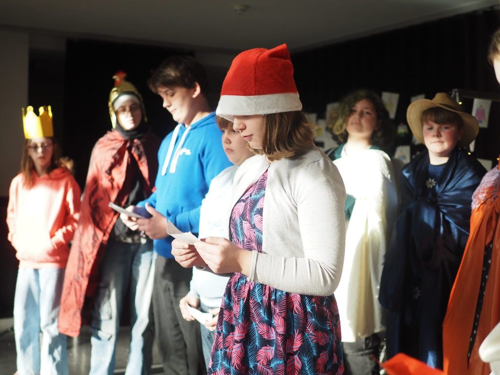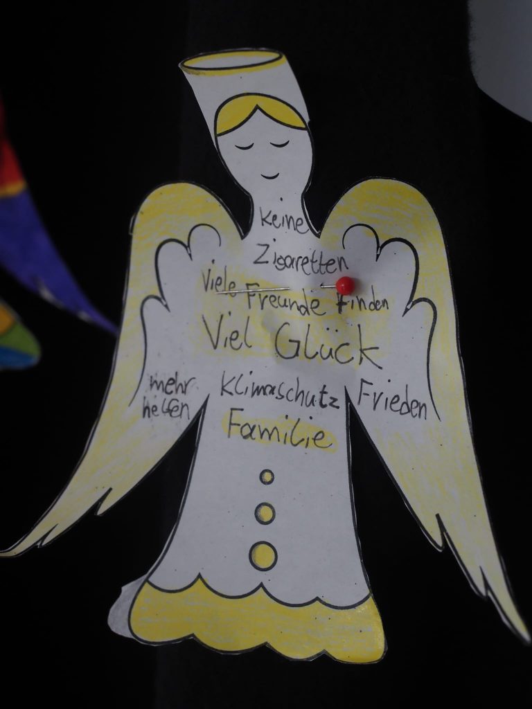 Es wurde gemeinsam gesungen, Fürbitten vorgetragen und die Weihnachtsgeschichte erzählt. Alle Schüler hatten Engel gestaltet, die feierlich am Bühnenvorhang angeheftet wurden