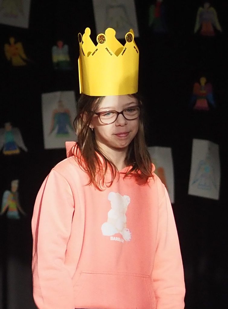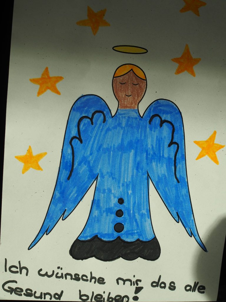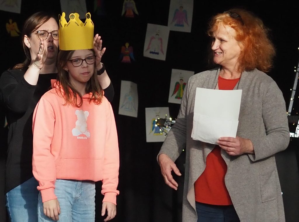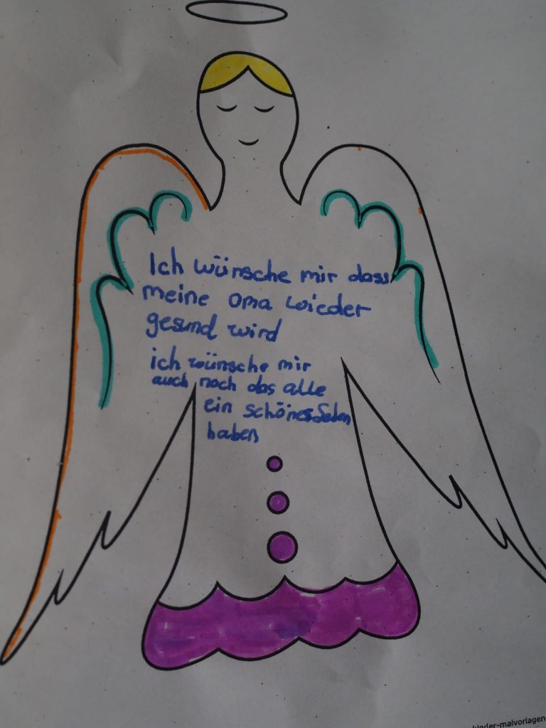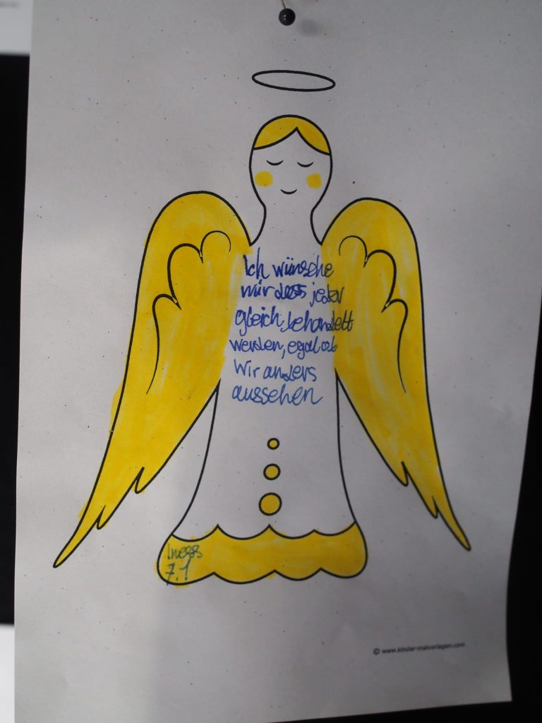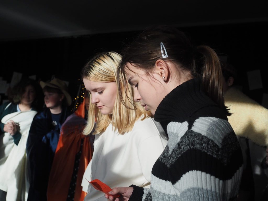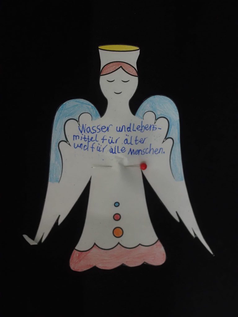 Es wurde gemeinsam gesungen, Fürbitten vorgetragen und die Weihnachtsgeschichte erzählt. Alle Schüler hatten Engel gestaltet, die feierlich am Bühnenvorhang angeheftet wurden